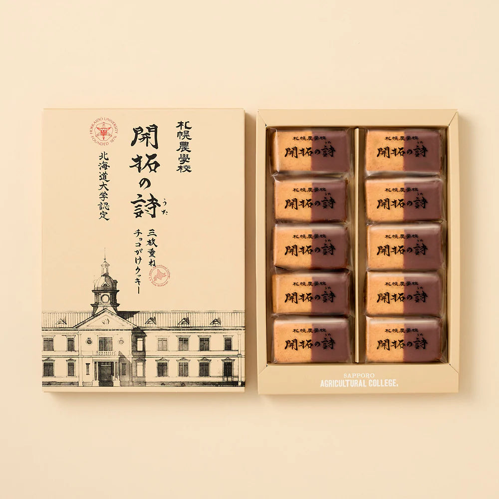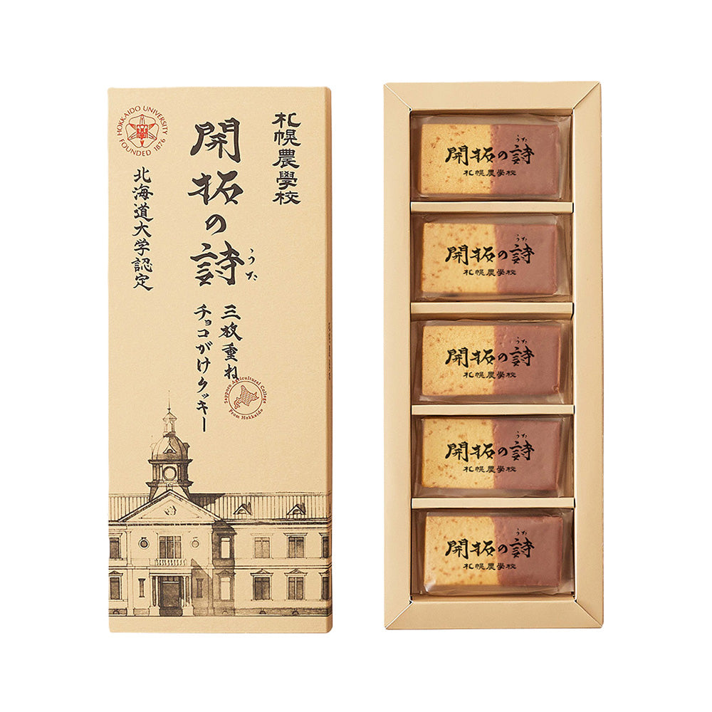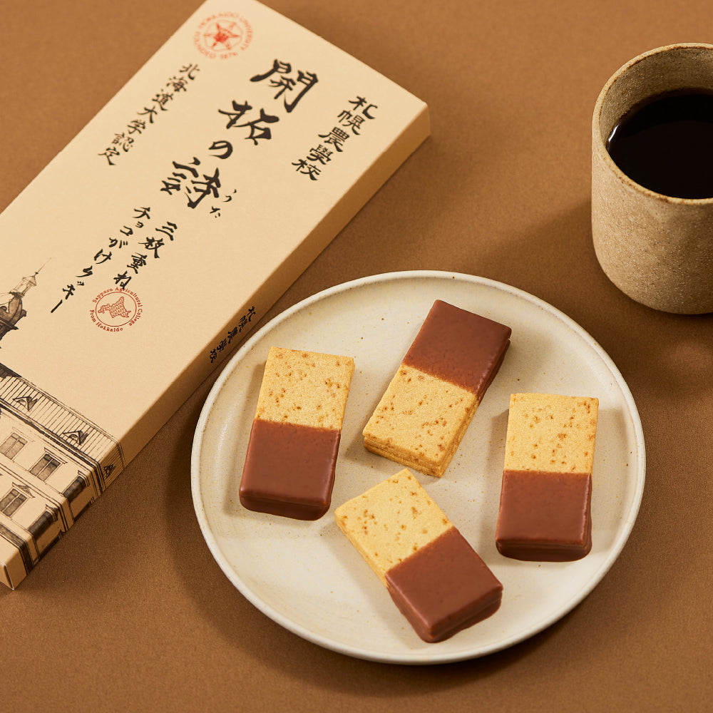 北海道産の小麦粉、バター、てんさい糖を使った薄焼きクッキーを三枚重ねにし、北海道産ミルクを使ったミルクチョコレートで半分だけコーティング。