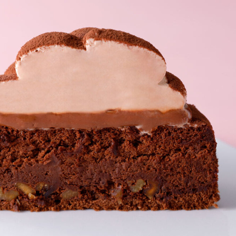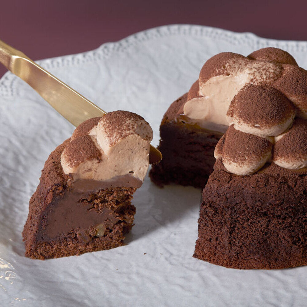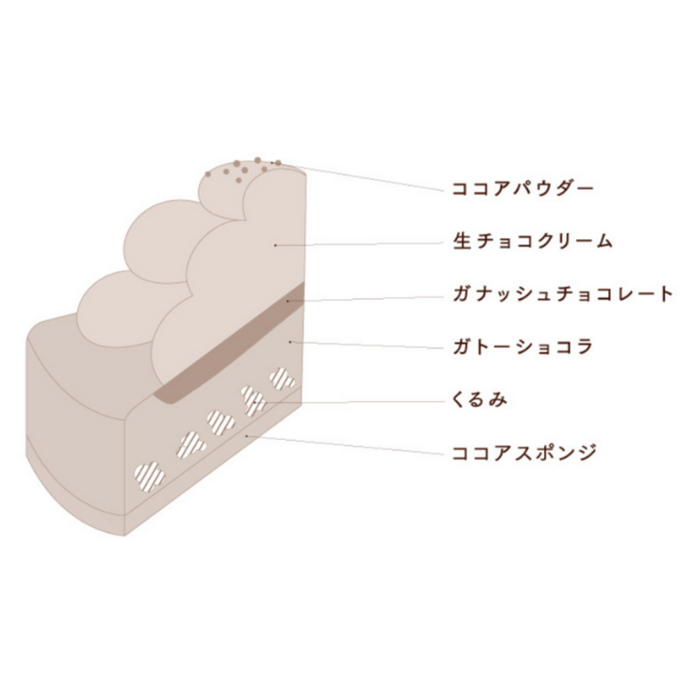 香ばしいくるみをアクセントにしっとりと焼き上げたガトーショコラとなめらかなガナッシュチョコレートのずっしり濃厚な味わいに、軽い口どけの生チョコクリームを一緒にお召し上がりいただくことで、それぞれの味わいが一体となり絶妙なハーモニーを奏でます。