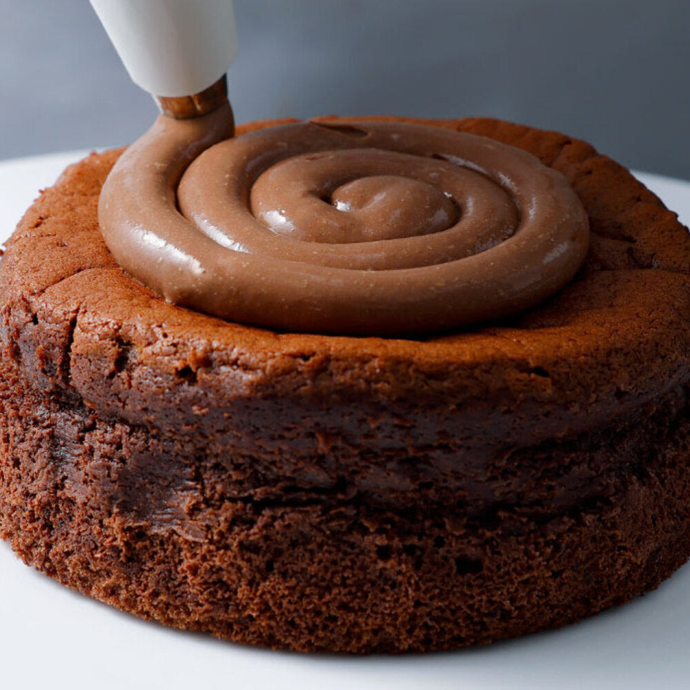ダークチョコレートに生クリーム、北海道産のクリームチーズをあわせた、なめらかで濃厚なガナッシュチョコレートをガトーショコラに重ねます。